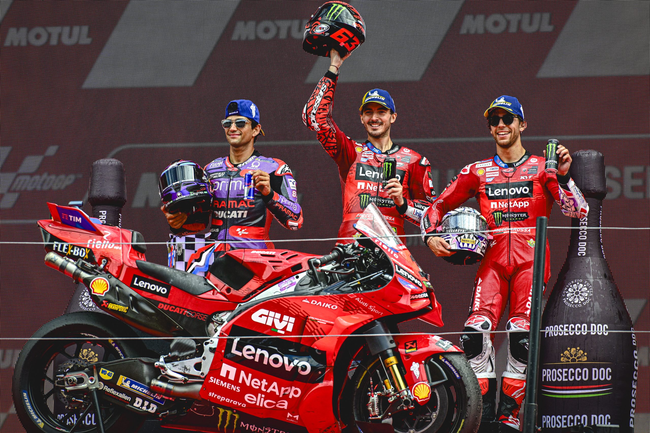 TT CIRCUIT ASSEN, NETHERLANDS - JUNE 30: Francesco Bagnaia, Ducati Team, Jorge Martin, Pramac Racing, Enea Bastianini, Ducati Team during the Dutch GP at TT Circuit Assen on Sunday June 30, 2024 in Assen, Netherlands. (Photo by Gold and Goose / Motorsport Images)