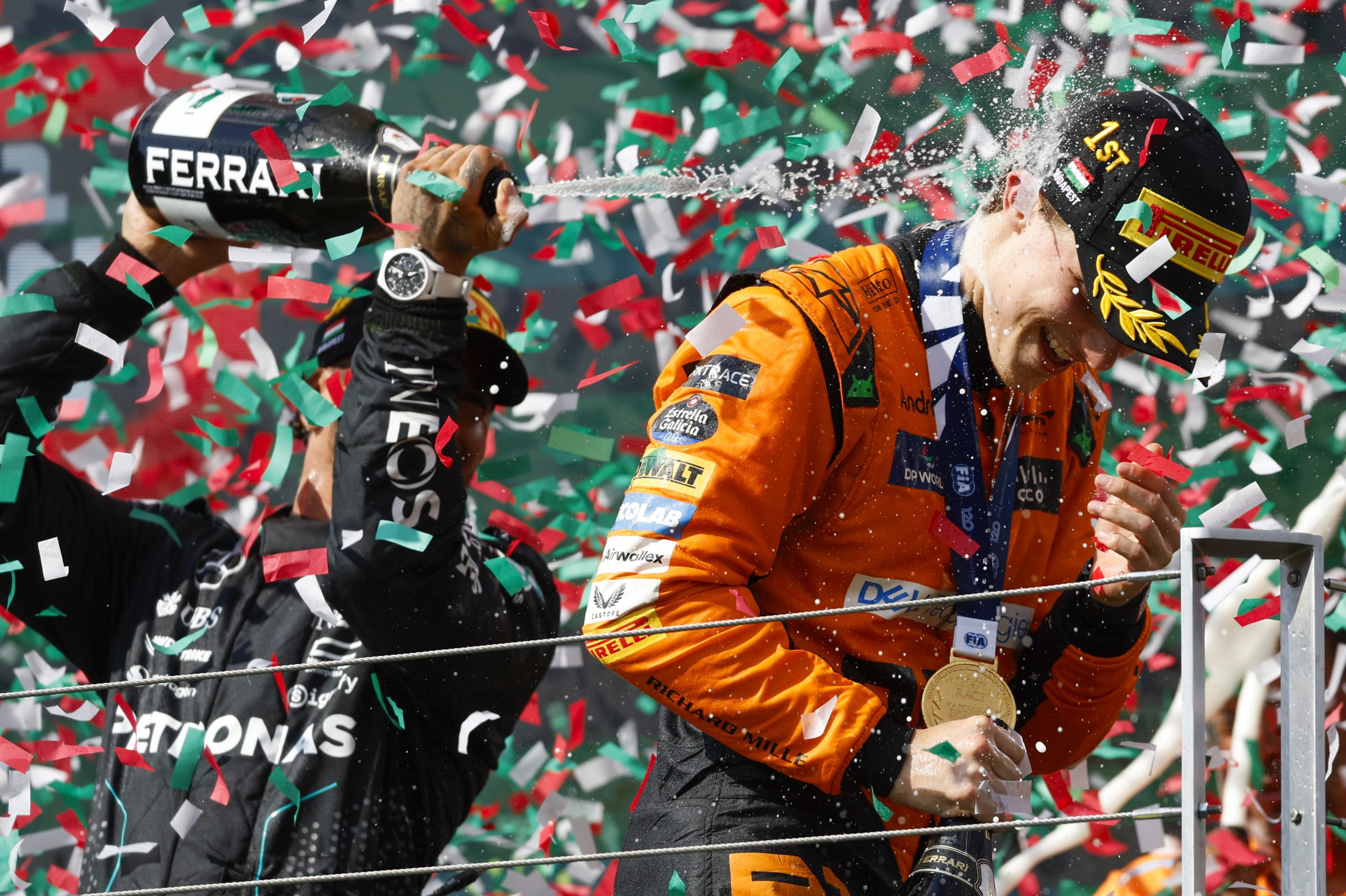 HUNGARORING, HUNGARY - JULY 21: Sir Lewis Hamilton, Mercedes-AMG F1 Team, 3rd position, sprays Oscar Piastri, McLaren F1 Team, 1st position, with Champagne on the podium during the Hungarian GP at Hungaroring on Sunday July 21, 2024 in Budapest, Hungary. (Photo by Glenn Dunbar / Motorsport Images)